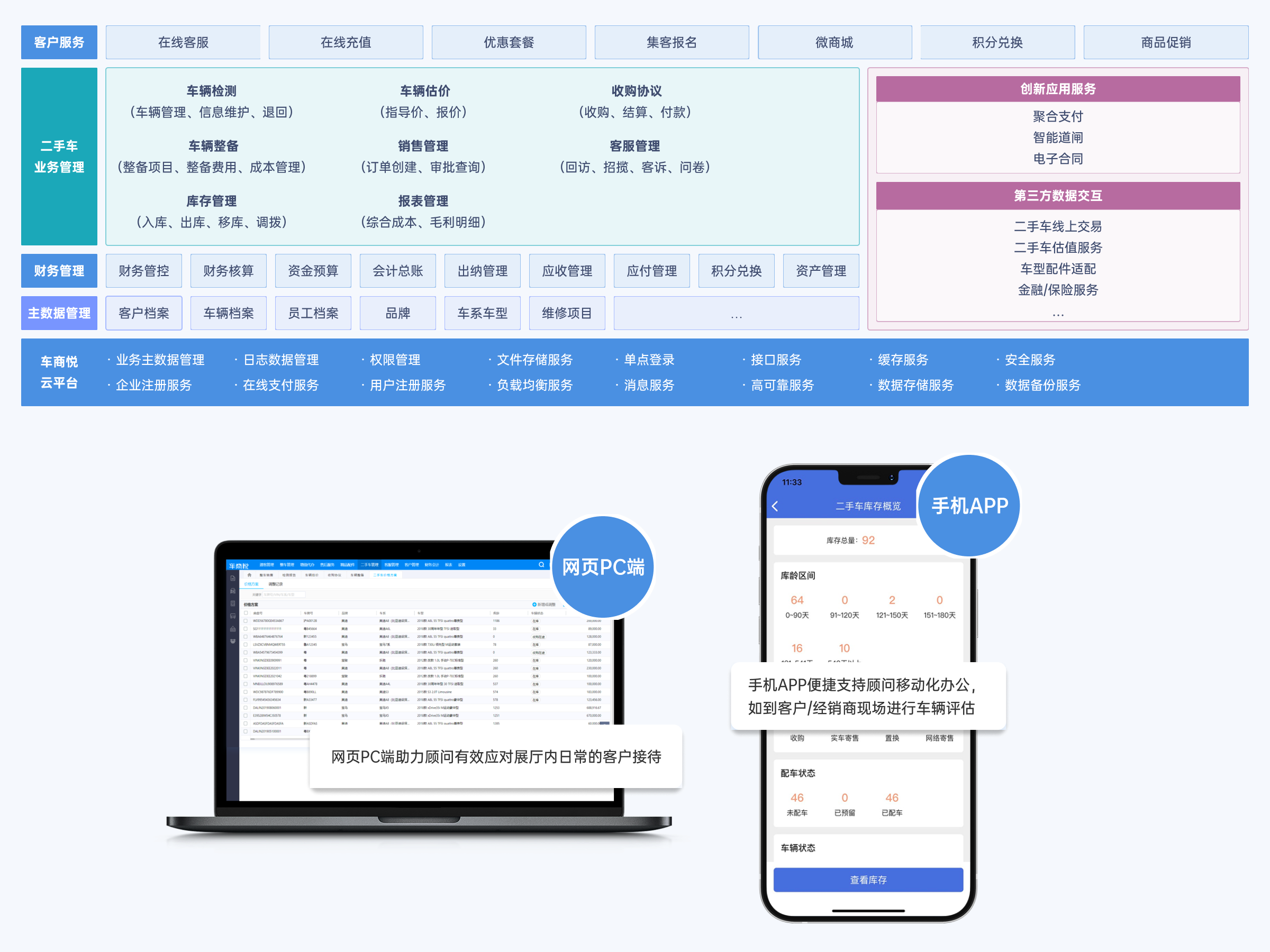 構(gòu)建以核心業(yè)務(wù)為基礎(chǔ)的二手車運(yùn)營服務(wù)平臺(tái),實(shí)現(xiàn)車輛檢測(cè)、評(píng)估、收購、銷售的閉環(huán)管理。